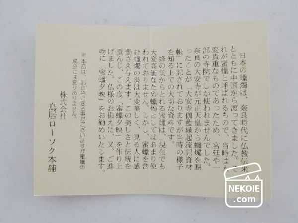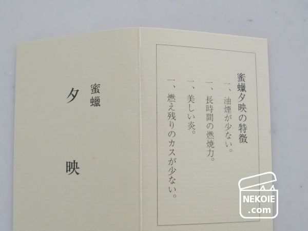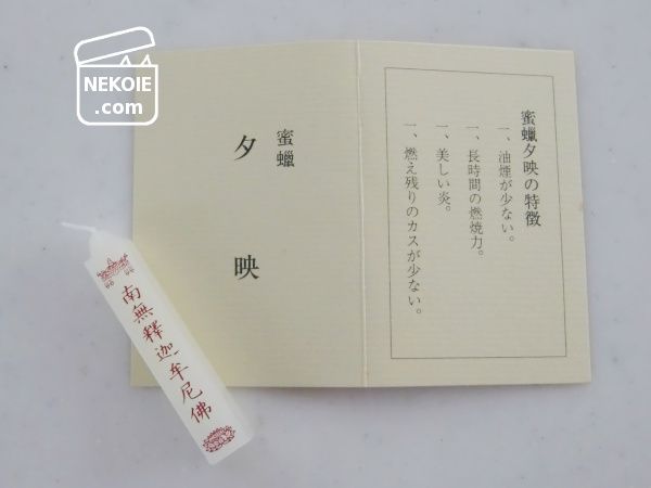 親戚宅は昔ながらのお屋敷でとても広く、時々納戸の片づけなどを手伝わせていただいています。今回はお盆間近とのことでお仏壇を中心に。その流れで出てきた、夕映(ゆうばえ?)という蜜蝋でつくられたロウソクをいただきました。