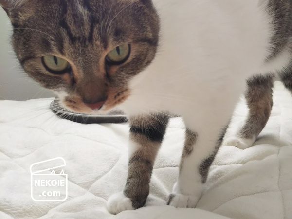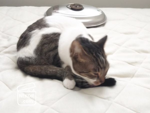 湯たんぽの隣でしっぽのお手入れに余念がない弟猫。彼の朝活です。