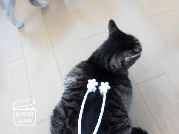 白いものは、数年前に買って、一時期かなり使い込んでいたマッサージ器(リンパ用)。でも最近使用頻度が下がってしまったので、これもお役御免で捨てるつもり…で出したのですが、猫が引きずりながらくわえて行きました。