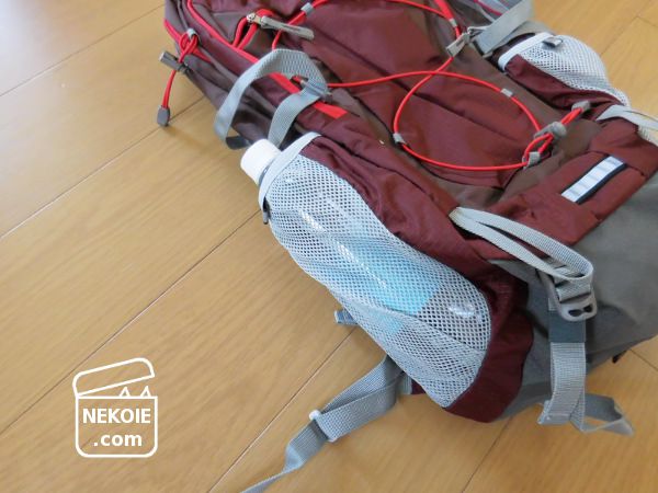 外側のメッシュポケットにはペットボトルがすっぽり。ビーチサンダル(素足での避難に備えて一足入れています)などもちょうどよく収まりました。