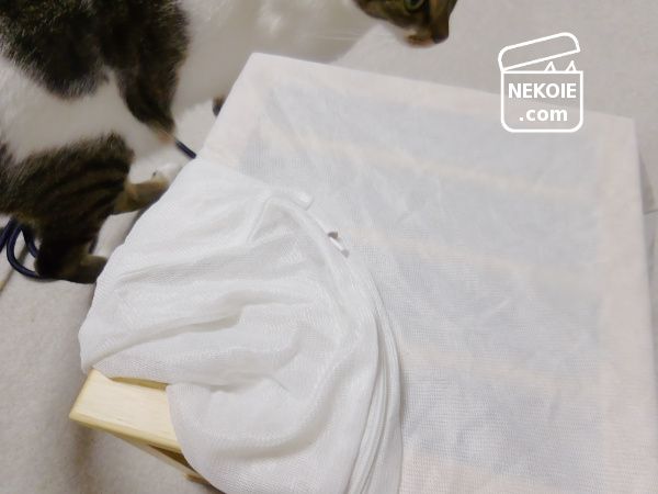 こちらは毛布などが入るサイズの洗濯ネット。本来使用中にカバーをかける必要はないのですがわが家の環境下では猫の毛が入ってお手入れが大変なので、その予防として目の細かいタイプの洗濯ネットに収めています。