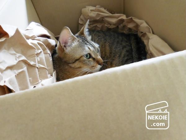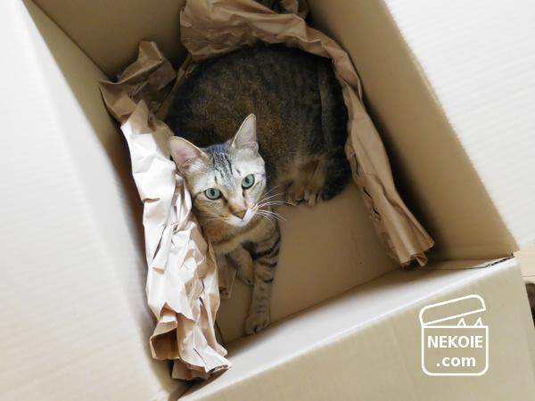 ダンボール争奪戦に打ち勝った、うちの猫印良品。