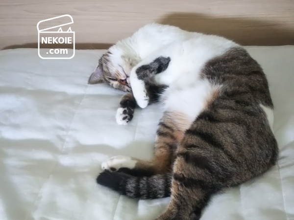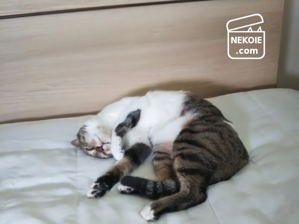 というのも、ある日突然、弟猫がクッションをよけて寝転がるようになったから。ベッドの上で寝ていることには変わりないのだけれど、これまで自らとびのっていたクッションの隣、シーツの上でごろごろするようになりました。