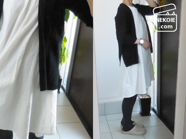 下に着ている白ワンピースが七分袖なのですが、カーディガンの袖にちょうどよく隠れます。スリットのおかげで、Aラインの形にも影響はなさそう。