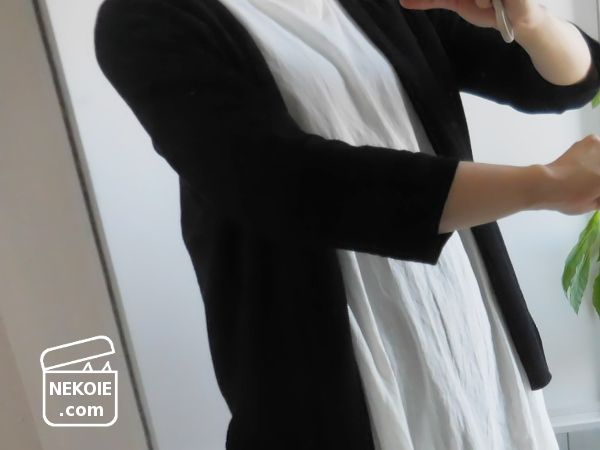 何より、黒を選ぶときに私が一番気になるのは「猫の毛」。このカーディガンはさらっとしていて、比較的ほこりなどもつきにくそう。多少ついても落としやすいと感じました。