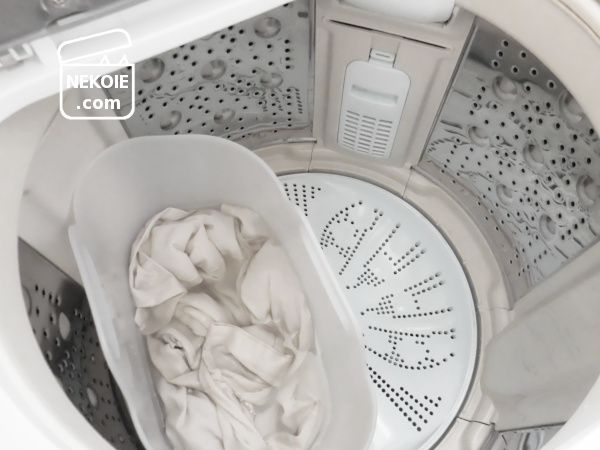 もちろんこのまま洗濯機の電源を入れるわけではありません。つけ置きしておいた衣類(軽く水を切ったもの)を洗ったり脱水したりするために洗濯槽へと移すとき、こうして一度ばけつごと入れてしまうと洗濯機の周りに水滴がぽたぽたと垂れることがないんです。