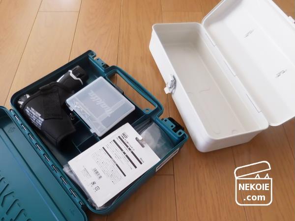 ただ側面に持ち手がついているので、置いているときと持っているときで「底」の面が変わってしまいます。軽い中身ならよさそうですが、私が入れたいのはずっしりした電動工具なので、ちょっとかさばるけれど屋根(蓋)に持ち手がついているタイプに決めました。