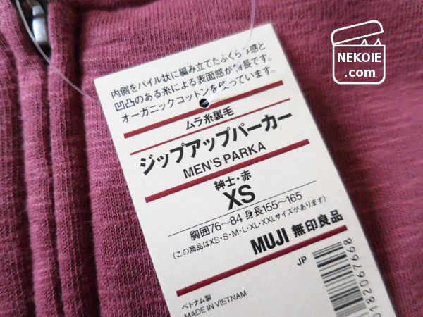 悩んでいるうちにメンズでも似たようなパーカーが出ていることに気づき、サイズを確認してみたら女性用より長め。色希望はとくになかったけれど、その時点で無印良品のネットストアに残っていた「赤(ややくすんだ色)」が気になり始めました。
