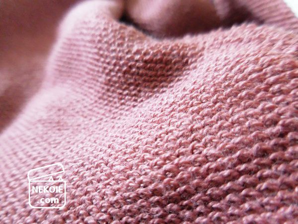 着丈は理想どおり。袖の長さは手の甲をすっぽり覆うくらいありますが、腕の短い私の指先が出ただけでも万々歳です。袖口のリブもしっかりしているので、心持ちひっぱりあげておけば動きにくさも作業しにくさもありませんでした。