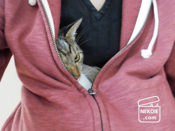ちなみに写真ではパーカーの中に直接猫を入れていますが、ふだんは抱っこひもを使うことが前提です。そうしないと私が立ち上がったとたん、猫が落っこちてしまいそうなので。