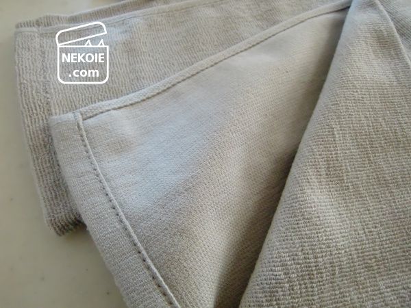 綿(オーガニックコットン)100%。片面(表側)はだいぶ短めのパイル、裏はほぼ起毛のない平織。