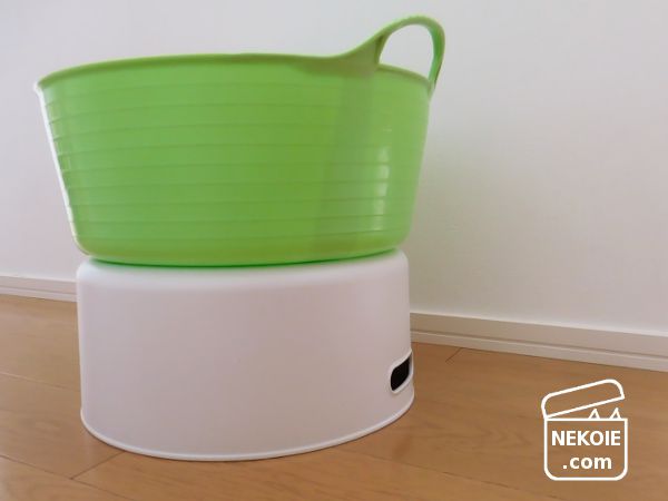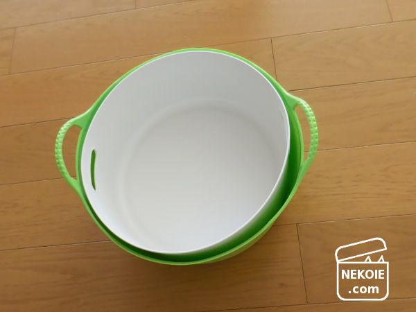 リサイクルポリエチレンが素材となっている少しやわらかいバケツです。サイズが複数ありますが、昔からあるものは海外製品らしい大型のものが中心。シリーズの中の「シャロー」というのが浅型で、わが家ではそれを猫たちのベッドの土台(うつわ)として複数活用してきました。
