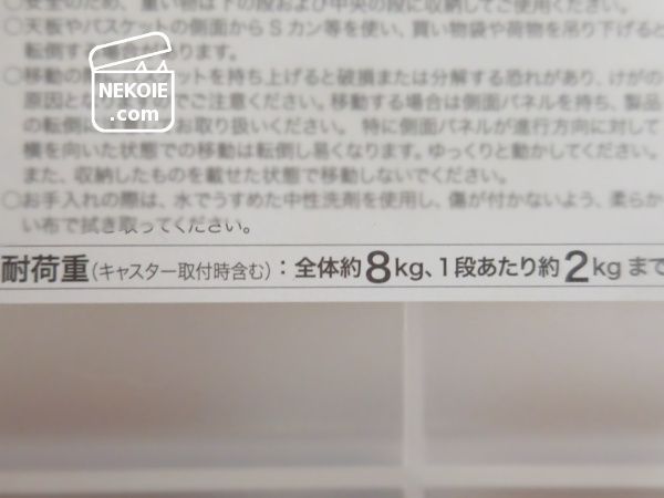 耐荷重:全体約8kg・1段あたり約2kgまで
