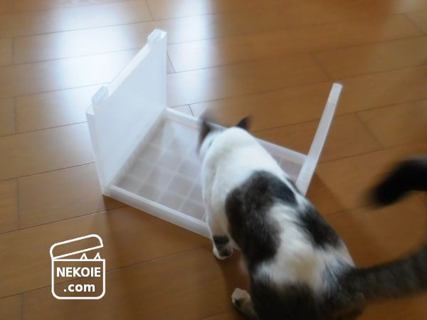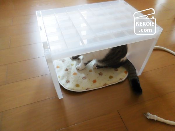 でも今回はシンプルに屋根ができるように設置し、内側にホットマットを敷いたら完成。ちょうど一猫が丸くなって寝るのにちょうどよいサイズなので、簡易的なこたつとして使うことにしました。