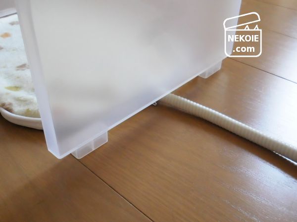 愛用しているペット用ホットマットは電源コードが補強されて太くなっています。急角度で曲げることのできないコードを配線するにはこれまでにも工夫が必要だったのですが、それも無理なく通すことができました。