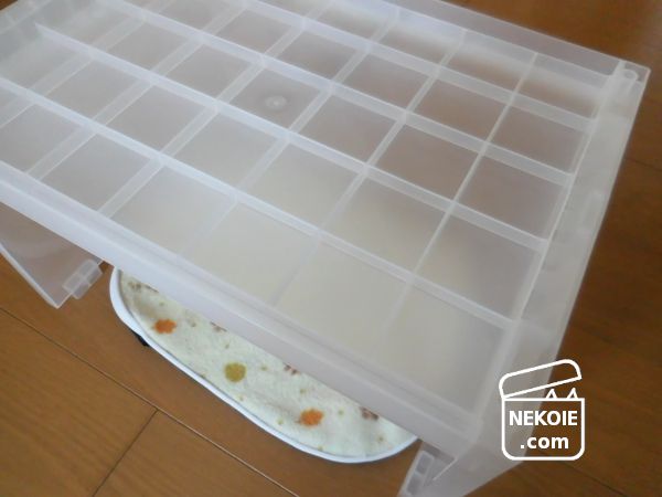 その面は補強のための凹凸があって上向きにすると汚れやすさが気になりそう。掃除もしにくいだろうと想像できるのだけれど、今後はミニこたつとして使うためにバスタオルやブランケットなどをかける予定。積もるほこりはさほど気にならないかなと思っています。