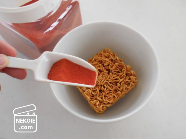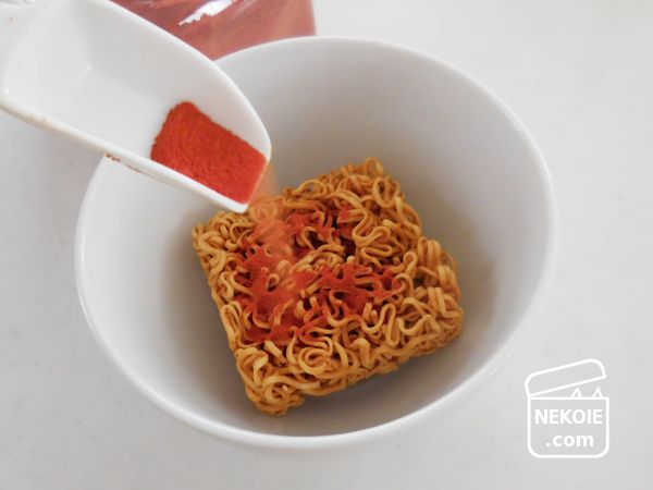 このパウダーを乾麺の上にふりかけて、いつものようにお湯を注ぐだけ。