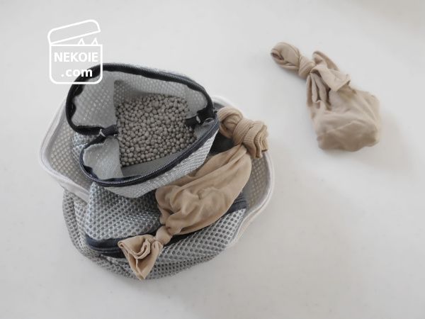 そのストッキングの中にムクロジの実を詰めて、(今も助剤としての効果には期待して)マグネシウム粒と一緒に洗濯機へ。