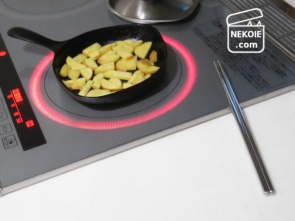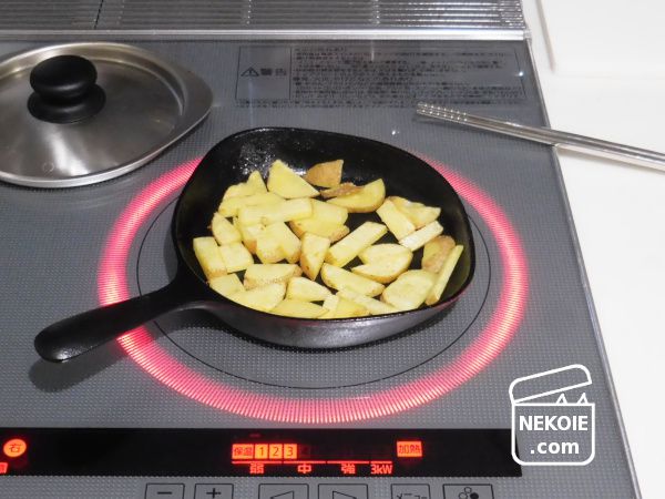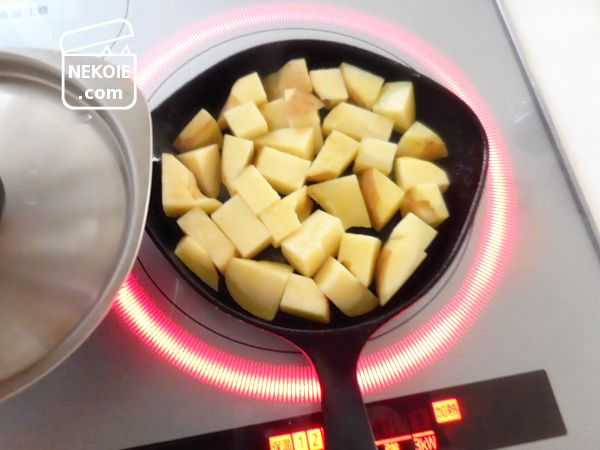 こちらはじゃがいもなのですが、さいの目切りと乱切りの感覚でカットしたもの。小さく、あるいは薄く切ればこのミニパンでも支障なく蒸し焼きにすることもできます。