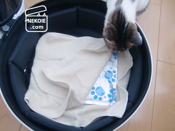 基本的にはふだんのキャリーバッグに保冷剤を入れて移動します。猫用(プラス私用)に買い置いているものをやや厚手のタオルに包んでバッグの底へ。