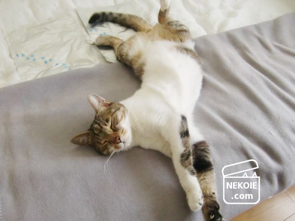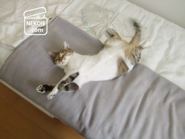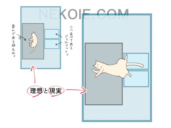 さまざまな工夫をするなかで好きなところで寝られるよう毛布やマットを敷いたり移動させたりしています。クールダウンを求めるならジェルマットの上で寝転んでもらい、逆に体が冷えたら毛布の上へ移動する。そんなふうに使えるように。