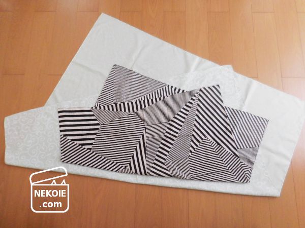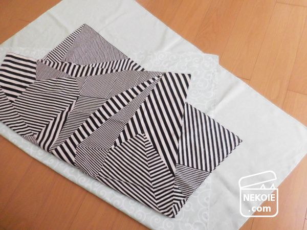 二四巾(白黒のほう)の風呂敷、小さいわけではないんです。新しい風呂敷が本当に大きい。商品ページにはベビーふとんがすっぽり収まるとも書かれており、わが家でも毛布などを包むのには使えそうだと思いました。これだと前述のようにバッグ型にするときにも完成時は大きめとなるし、厚みがあるのでちょっと重いものを運ぶためのエコバッグとしても優秀です。