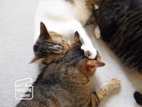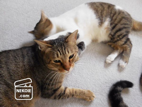 兄猫組と弟猫。あまりくっついていることがないので関係性について心配することも多いのですが、たまに見せてもらえるこういう光景には胸をなでおろしてしまいます。