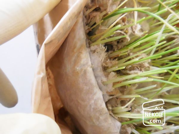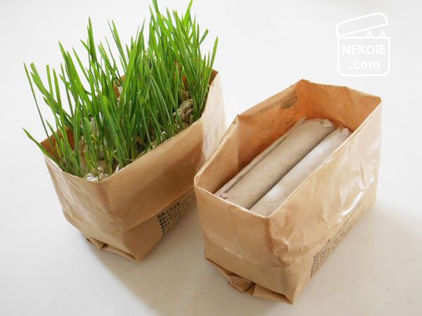 無印良品の猫草は、防水加工がほどこされた紙袋を開き、中材に水を含ませて発芽を待つだけ。とてもお手軽な栽培セットです。