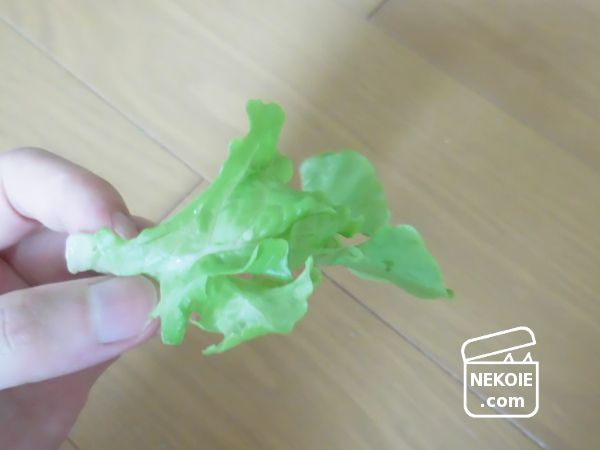 種類にもよるけれど、味つけ前の生野菜ならその用途にもぴったり。そしてレタスは多少なら猫にあげてもよいとされる野菜で、小さくするのに包丁などもいりません。とても便利なのでした。