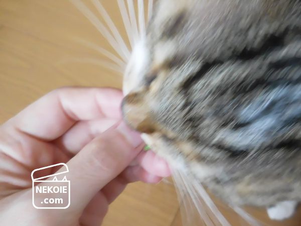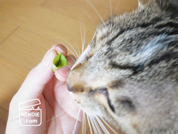 猫草をメインにはしていますが、食事のしたくをしていると遠巻きにそわそわしている弟猫。作業内容によっては隔離させてもらうのですが、扉で隔てた向こう側で心細そうに鳴き続けることも多く、ちょっとつまんであげられる食品を重宝するんです。