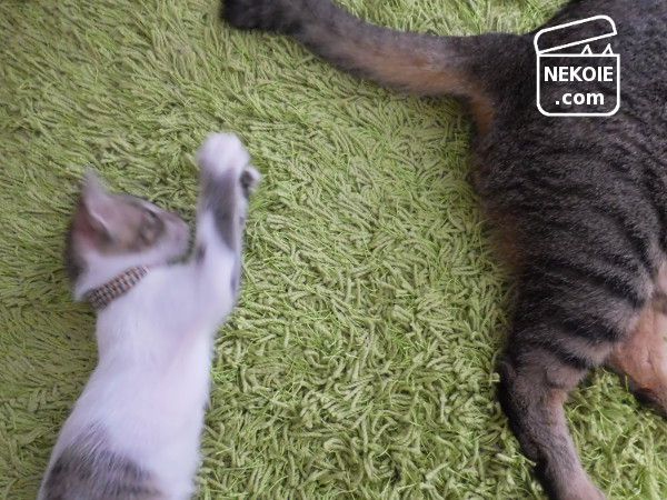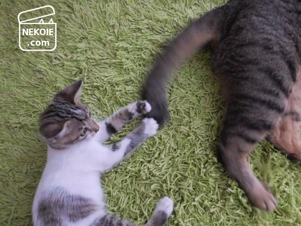 もちろん子猫を含めていっしょに遊ぶこともできるのですが、あえて年長組とだけ一定時間をすごし、彼らを全力でねぎらう。