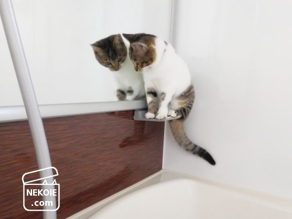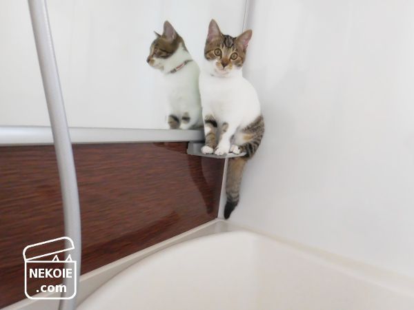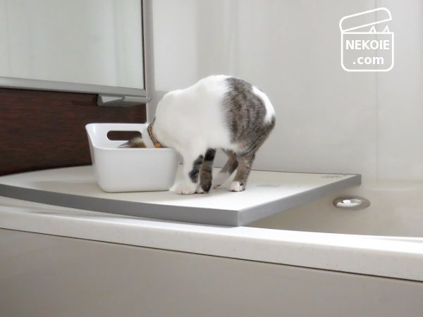 私の入浴中、子猫の定位置は半分だけ残したプレートタイプのバスタブ蓋の上。ここでゴロゴロしたり、持ちこんだおもちゃ(スーパーボールなど)を転がして遊んだり、毛づくろいしたり。濡れるのにもまったく抵抗がないようで、洗い場に下りて探検したり、湯船の水面に手を伸ばすことも。