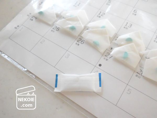 そして一部の猫は、動物病院で処方された薬を定期的に服用しています。症状や薬によって毎日の場合もあるし、三日に一度の場合も。また薬を飲ませるのが私の場合もあれば、家族にお願いする場合もあるので、混乱しないようにお薬カレンダーを自作するようになりました。