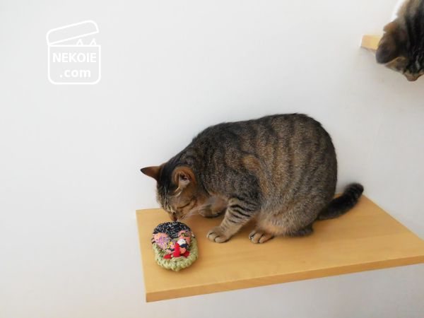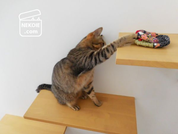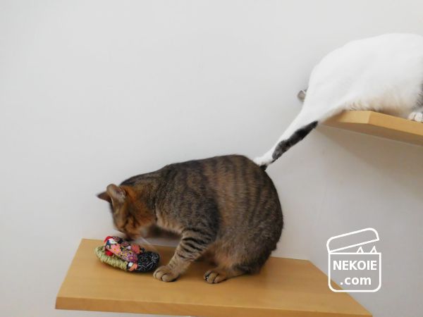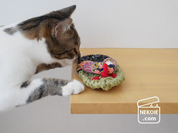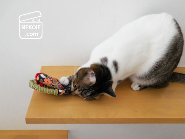 実は事前にまたたびの葉といっしょに袋に入れておいたんです。その香りが移ったおかげか、いつもはおもちゃをスルーする兄猫も興味津々。