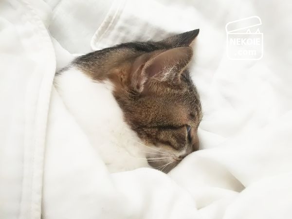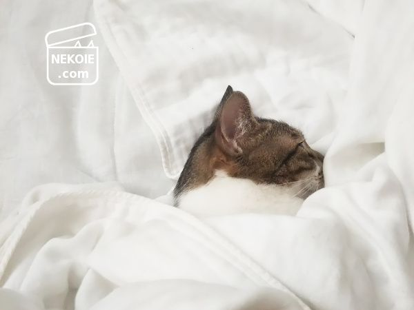 猫もガーゼケットに包まれたくなる、少し肌寒い梅雨の朝。