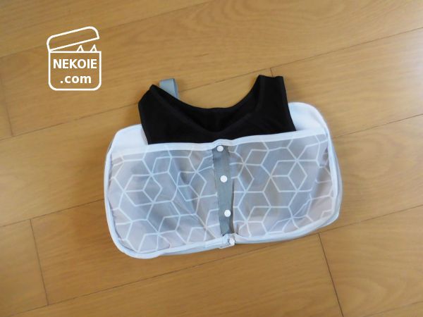 ちなみに撮影に使っているのは未使用のナイトブラです。もともとこの洗濯ネットを買い足したのは、このナイトブラを洗うためでした。ワイヤーが入っていないソフトカップのもので、そんなに型崩れも気にならないかなとコンパクトな洗濯ネットを選びました。