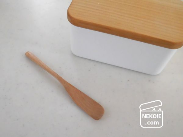 野田琺瑯のバターケースの蓋は無垢の素材そのままのようですが、他社製バターナイフのほうはウレタン塗装がされていて木製なのに食洗機にも対応しています。
