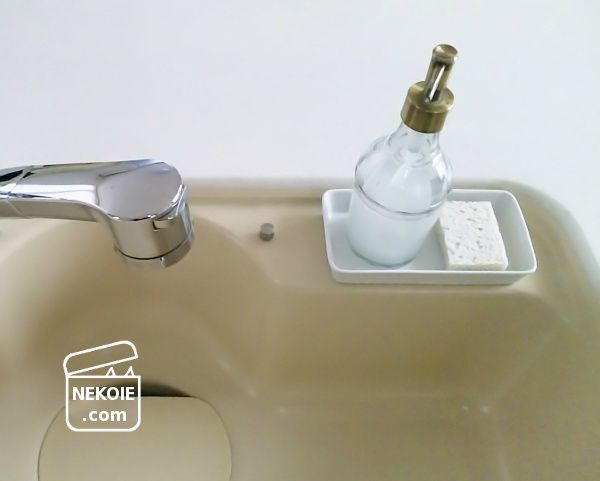 右手でスポンジを持って、左手で洗剤のポンプを押せる順番で、セットで角皿にのせています(紆余曲折ありましたが、今の形がベストかなと)。