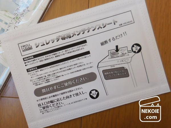 電動シュレッダーを購入した最初の一年は、刃のメンテナンスをせずに使い続けてしまったのですが、二年目でキィキィ音が気になり始めました。その問題も、このシートを使うことで解消(最初の一枚はお試し品でした)。