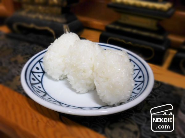 今日はお盆で帰ってきているご先祖さまが、おこづかい(生前使われていたお財布にお金を入れておく)とお弁当(おむすび)を持って買い物に出かける日。おむすびにはうるち米に小豆を加える地域もあるようですが、当一族(?)では塩むすびでよいとのことで私がにぎらせてもらいました。