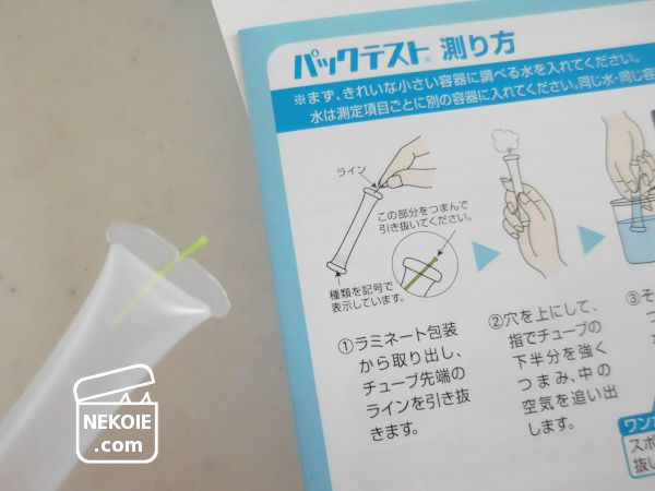 穴部分を上向きのままチューブをぎゅっと押して空気を抜き、そのままチューブから手を放さないようにしながら逆さにし、検査する水の中に先端を投入。指を離せば抜いておいた空気のぶんだけチューブの中に水が入ります。