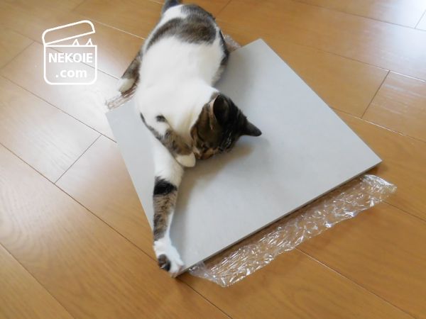 絨毯素材のカーペットタイルが「爪とぎ」を兼ねるなら、こちらの硬質タイルは「夏場の寝床(ひんやりスペース)」の兼用です。ペット用の冷却ボード(夏の冷房補助アイテム)でも磁器製を見かけたことがあったのですが、せっかくなのでわが家では今回も床材を兼ねるものに決めました。