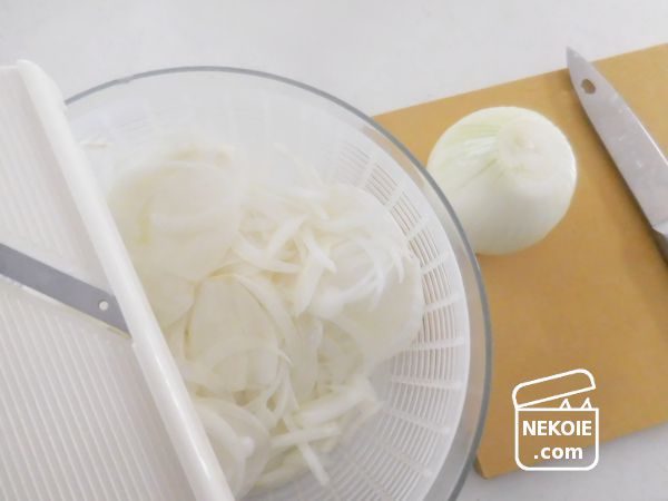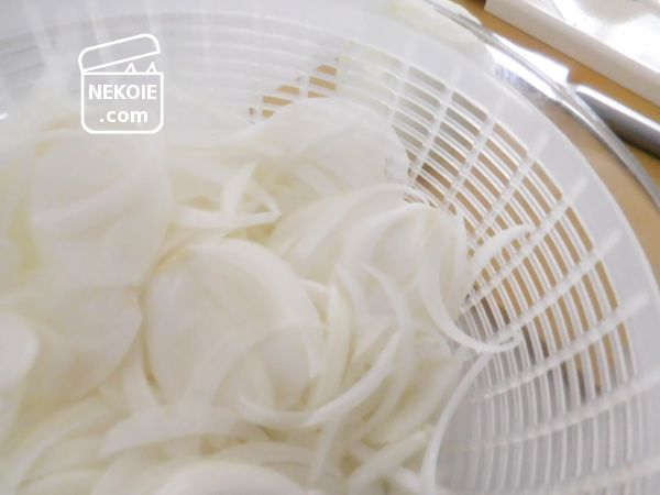 真っ先に始めたのは、従来どおりの水にさらすという方法。スライスした玉ねぎをたっぷりの水に浸して十分ほど待ち、ざるにあげたら完了です。