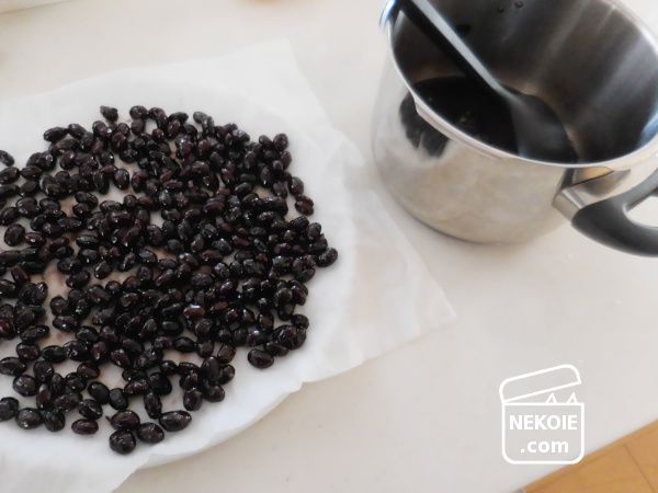 重箱に詰めるには少し多めに煮ておくため、半分ほどはもう少し煮詰めたものを乾燥させ甘納豆に。