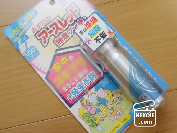 - おすだけアース(120プッシュ分・26ml)、購入時は1,200円ほど。ワンプッシュで1mほど先まで届く霧が出る。目視の上で、あまり拡散はしない。