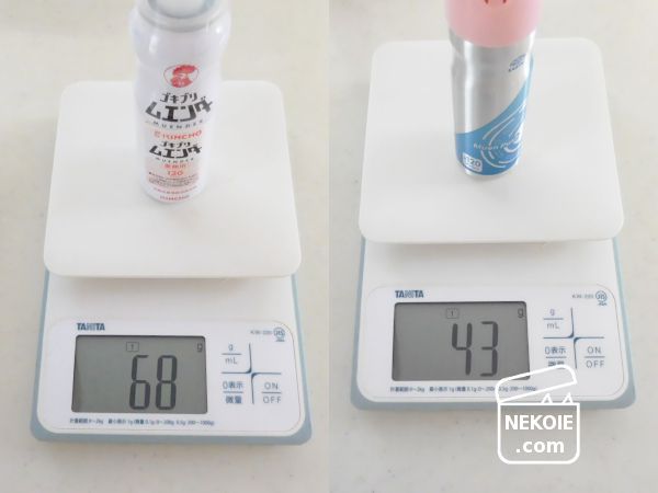 成分も容器も違うのでこれも単純比較しかできないのですが、たしかに重さも違いました。