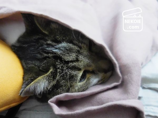 室内はそれなりに暖かいはずなのですが、寝ている猫にコットンストールをかけてあげたら心地よさそうに寝入っていました。