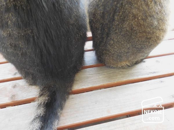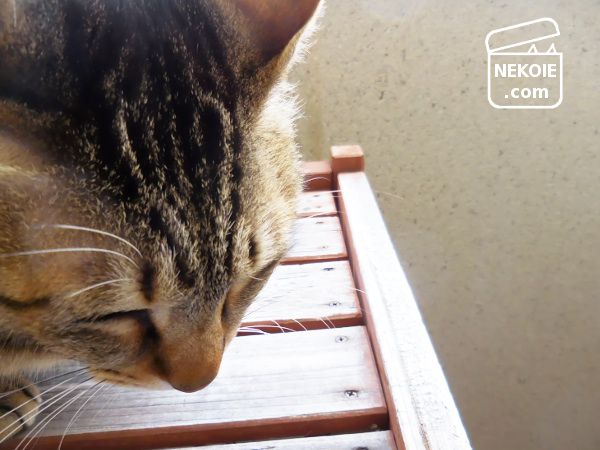 昼の土砂降りが嘘のように晴れた午後、空気の入れ換えを兼ねて、猫たちとベランダへ。