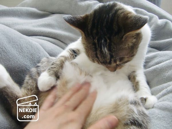 弟猫にも気に入ってもらえている起毛寝具の上、ぱかっと開脚して毛づくろい中。
