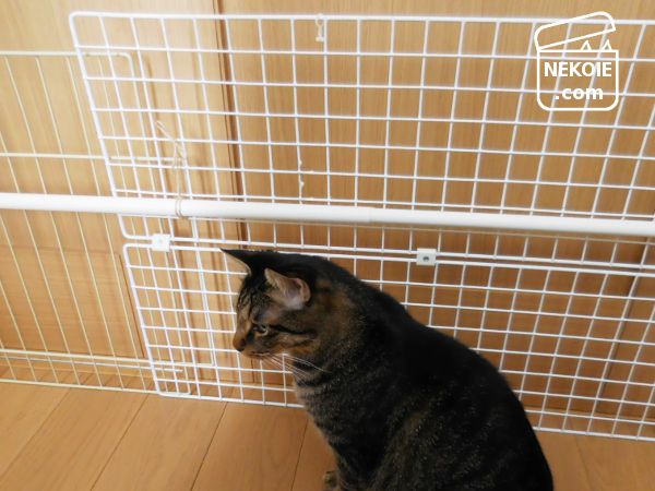 私が設置していたゲート(ワイヤーメッシュの柵)は、もともと「脱走防止」というより「こっちに来てはダメ」とゆるくアピールするためのものでした。突破してもその先は玄関などの脱走ルートではなく、家族の私室やキッチンなど。できれば入ってほしくないな、くらいの場所です。